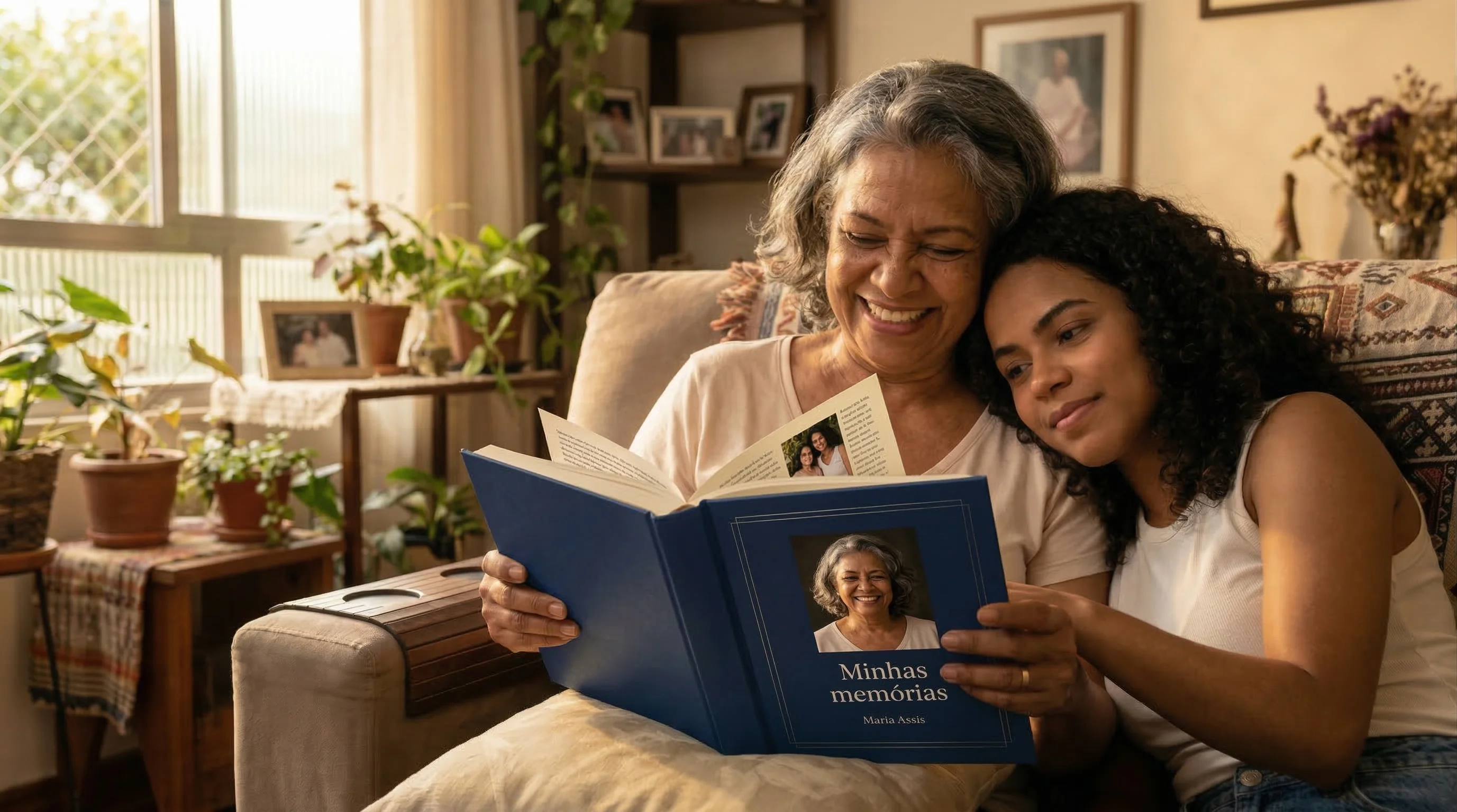 Após semanas de conversas, os fragmentos aprovados se transformam em capítulos de um livro impresso de alta qualidade — com capa personalizada, fotos e 150+ páginas de memórias.
